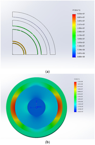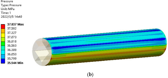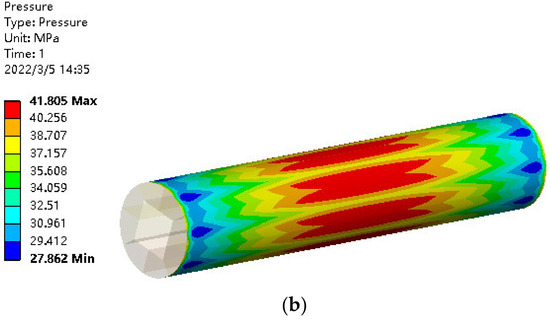 The postprocessing method was the same as the above setup except for the geometric interference. Results are shown in Figure 11a,b (unit of interface pressure is marked in each picture (MPa)).
