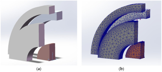 To further verify the simulation results, we analyzed and verified the simulations in the SolidWorks simulation environment. First, we defined the material properties (ignoring some structures that did not affect the amount of stress, such as water-blocking and shielding layers) before modeling. The structure was composed of a conductor, cross-linked polyethylene insulation layer, sheath, and polyethylene layer from inside to outside. The material properties were the same as those listed in Table 1, but the inner and outer diameter values were those of Part B in Table 2. We used a quarter-circle model instead of a full cross-section circle. We added a fixed and a symmetry constraint. Because cables under normal placement have no load, mutual force is generated by interference fit. For this reason, we designed a method to calculate the interface pressure using SolidWorks software and established a new model. After the setting had been completed, the model was as shown in Figure 12. Figure 12a shows the model built with SolidWorks, and Figure 12b depicts the meshing. The blue part in Figure 11 is the coordinate system.