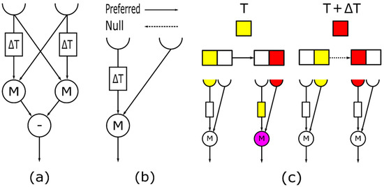 For numerous animals, vision plays a critical role in receiving information from the outside world [1]. In recent decades, scientists have discovered separate visual processing systems in different species of animals, and each system is dedicated to processing its own interesting features [2,3,4]. Among these functional processing systems, motion perception is considered the most basic visual capability because of its widespread presence in the visual system, ranging from vertebrates to invertebrates [5]. Research on motion perception can be dated back to 1894, when Exner first presented a drawing of motion detection neural networks [6]. In 1912, Wertheimer introduced the Phi phenomenon and revealed that motion can be seen in two stationary flashes [7]. The discovery that optic nerve fibers’ activities can be recorded by the discharge of impulses makes it possible for biologists to conduct research on single ganglion cells [8,9,10,11]. After the observation of many retinal ganglion cells in the receptive field with light-specific responses [12,13], neurons that respond to movement in a direction-selective way have been observed in both the mammalian retina (direction-selective ganglion cells, DSGCs) and the insect optic lobe (lobula plate tangential cells, LPTCs) [14,15].