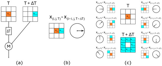Considering the findings that the fly’s motion pathways seem to take achromatic inputs and either the L1 pathway or L2 pathway is sufficient to drive the optomotor response at high pattern contrast, in this paper, we design a local motion-sensitive directionally detective neuron with a 3 × 3 local receptive field and make them respond to ON motion signals with high pattern contrast based on the core computation of the HRC model (shown in Figure 2a). Mathematically, we assign the value of 1 to the signals and the value of 0 to the background. Figure 2b shows the rightward local motion-sensitive directionally detective neuron. We use notations to indicate the signal from the centrally located photoreceptor at time T, and denotes the signal from its right-side photoreceptor at time T + ∆T. The activation result of the rightwards local motion-sensitive directionally detective neuron can be expressed by the following equation: