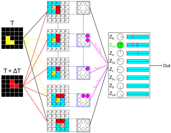 Moreover, we extend our proposed neurons to two-dimensional multi-direction detections. Based on the concept of local receptive field [13], we employ 8 local motion-sensitive directionally detective neurons for detecting 8 directions, respectively. As shown in Figure 2c, they are 0°-detective neuron (Rightward, R), 45°-detective neuron (Upper Rightward, UR), 90°-detective neuron (Upward, U), 135°-detective neuron (Upper Leftward, UL), 180°-detective neuron (Leftward, L), 225°-detective neuron (Lower Leftward, LL), 270°-detective neuron (Downward, D), and 315°-detective neuron (Lower Rightward, LR). The equations of extended neurons’ activation results can be expressed as follows: