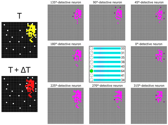 In the third series of experiments, we test our AVS within the background with 1% to 10% connected noises. The dataset has a total of 192,000 images (each object has 24,000 images), and the detection results are presented in Table 3. Through observation, it can be found that the connected noises do have impacts on the detection results, especially when the object’s size is small. However, as the size of the object increases, the detection results will return to high accuracy. The activation plots of the AVS for a 64-pixel object motion direction detection within the background with 2% connected noises have been presented in Figure 7, and the error activations due to noise are represented by the purple dots. The activation numbers of eight local motion-sensitive directionally detective neurons are: 0°-detective neurons 33, 45°-detective neurons 31, 90°-detective neurons 35, 135°-detective neurons 38, 180°-detective neurons 43, 225°-detective neurons 64, 270°-detective neurons 41, and 315°-detective neurons 34. Thus, the global direction of this 64-pixel object’s motion is Lower Leftward.
