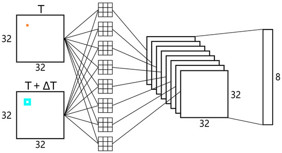 In the last series of experiments, we compare the performance of the AVS, the time-considered CNN, and the EfficientNetB0. In recent research, convolutional architectures performed well in tasking audio synthesis, and convolutional networks are regarded as the natural starting point for sequence modeling tasks [58]. Therefore, we propose a time-considered CNN train it for the task of detecting the global direction of motion. The time-considered CNN is made up of eight convolution kernels (3 × 3), eight feature maps (32 × 32), and eight outputs. The structure of the time-considered CNN is shown in Figure 8. At first, we used the dataset with no noise in the background and randomly picked 3000 images out of 24,000 images from each size of the object’s dataset to form a new dataset. Then, we picked 15,000 images in the new dataset for training the CNN and the EfficientNetB0 and then used 5000 of the remaining images to form the test dataset. Finally, we saved the CNN and the EfficientNetB0 when the training accuracy reached 100% and compared their performances with the proposed AVS. The accuracy rates on the test dataset are: AVS 100%, the time-considered CNN 63.6%, and the EfficientNetB0 100%. Furthermore, we performed a comparison of the three models in detecting the dataset with separated noises and the dataset with connected noises. These detection results are shown in Table 4, Table 5, Table 6 and Table 7, respectively. We can easily observe from these tables that our AVS has better performance than the time-considered CNN and the EfficientNetB0. Furthermore, since our AVS cites the spatial structure of the basic form of the HRC model, the requirements on the dataset are almost none, while the CNN and the EfficientNetB0 need a large amount of data for training.