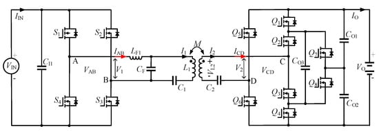 Numerous compensation networks, i.e., series–series (SS) [7,8], series–parallel [9], double-sided inductor–capacitor–capacitor (LCC) [10], and inductor–capacitor–capacitor/series (LCC/S) [11,12], have been studied to compensate for the loosely coupled coils. The magnetic coupling coefficient varies significantly for different positions between the transmitter coil and receiver coil. Various methods are studied to achieve a wide voltage range over different load conditions and magnetic couplings. An extra DC–DC stage is added to the secondary side for wide output voltage regulation in [13,14,15]. However, the extra DC–DC stage deteriorates the power density and also degrades the power efficiency due to power losses on additional components.