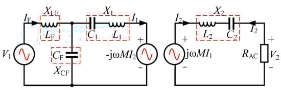 The circuit diagram of the LCC/S-compensated IPT is shown in Figure 1. It consists of a full-bridge inverter, an LCC resonant network in the primary, a series-connected resonant capacitor in the receiver, and a neutral-point-clamped TL rectifier. The circuit diagram can be simplified to an equivalent circuit in Figure 2 based on the fundamental harmonic approximation method. The fundamental components of VAB and VCD are denoted as V1 and V2, respectively. In case the inverter’s phase shift is π, V1 can be solved as follows: