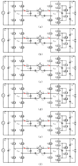 Operating modes in one switching cycle: (a) Mode A, (b) Mode B, (c) Mode C, (d) Mode D, (e) Mode E, and (f) Mode F.