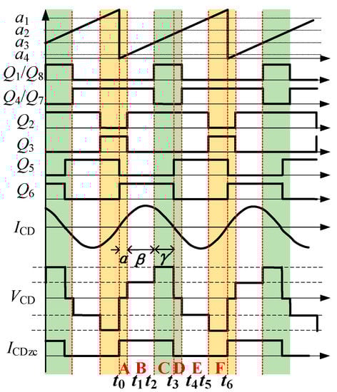 The secondary resonant current ICD is fed into the TL rectifier, as shown in Figure 1. Six modes exist in one switching cycle Ts without consideration of the dead time; the corresponding conducting circuits and key waveforms are illustrated in Figure 3 and Figure 4, respectively. Moreover, the driving signals of each MOSFET pair, i.e., Q1 and Q4, Q2 and Q3, Q5 and Q6, and Q7 and Q8, are controlled complementarily. Moreover, MOSFETs Q1 and Q8 share the same driving signal, and MOSFETs Q5 and Q6 can be replaced by diodes. VCD has five levels, i.e., 0, ±0.5VO, and ±VO, with the duration of αTs, βTs, and γTs, respectively. The sum of α, β, and γ is 0.5. The rising edge of the zero-crossing pulse ICDzc aligns with the rising edge of VCD from negative to zero at t0.