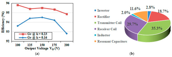 The system efficiency at full load with different k and VO was measured, which is plotted in Figure 10a. The high secondary resonant current resulted in a significant efficiency drop under misalignment. When k was 0.23, the control trajectory for the voltage gain between 1.4 and 2.8 was located on the γ axis, with α = 0, shown in Figure 5d, which is proven in Figure 8c,d. Additionally, the voltage V2 was 94 V, which is close to the minimum output voltage of 100 V. Thus, the system demonstrated the highest efficiency when the voltage conversion ratio of the TL rectifier between V2 and VO was close to one. The efficiency dropped when VO increased because the voltage conversion ratio of the TL rectifier became smaller, and the reactive power in the TL rectifier increased. When k was 0.16, the control trajectory for the voltage gain between 1.4 and 2.8 is located on the bottom left corner of the α and γ axes, shown in Figure 5c, which is proven in Figure 8a,b. The efficiency reached its lowest point at the maximum output voltage VO of 200 V because the secondary resonant network was shortened by the TL rectifier in both Modes A and D of Figure 3, when α was not zero, as shown in Figure 8b. In addition, a larger α resulted in more reactive power losses of the TL rectifier according to Figure 5c.