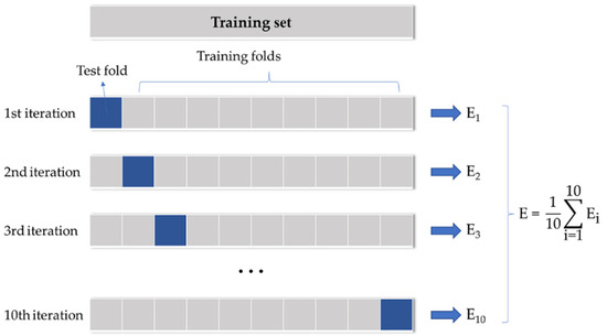 We take an example where k is 10 and the calculating procedure is shown in Figure 5. By increasing the value of k, more data will be used for the model training in each iteration, which can obtain the minimum deviation and prolong the algorithm time. Reducing the value of k can reduce the calculation cost of the repeated fitting performance evaluation on different data blocks. While training the SVM model, cross-validation (cv) is an important element needed to be discussed.