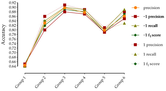 Model Evaluation Index for different feature groups and labels. The solid line with a circle represents the prediction accuracy of the whole classification model.