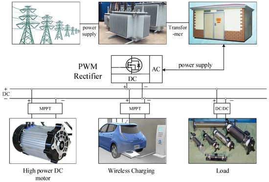 In recent years, the development and improvement of new energy have attracted much attention. Many new energy resources have great potential to compete with traditional power sources. However, new energy sources can make power generation unstable and lower the power factor. In order to solve that problem, many new energy distributed generation systems are equipped with energy storage devices for suppressing power fluctuations, peak clipping, and energy scheduling [1,2,3,4,5,6,7,8]. Pulse width modulation (PWM) rectifiers are widely used in new energy storage devices and have become an important component between energy storage devices and the power grid [9,10,11,12,13,14,15]. The block diagram of the hybrid power generation system of new energy and energy storage devices is shown in Figure 1. Electric energy is distributed through high-voltage transmission lines, transformers, and power distribution cabinets. The rectifiers modulate the electric energy and finally transmit it to electrical equipment.