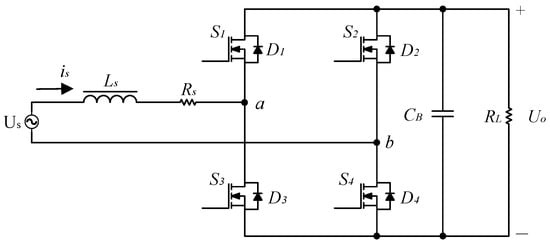 The topology of the single-phase PWM rectifier is shown in Figure 2. The topology is mainly composed of a Boost inductor and four fully controlled power switching devices. Us is the AC input voltage; Uo is DC output voltage; is is the input current; LS is the input boost inductor; RS is the equivalent resistance; CB is the output filter capacitor; RL is the output load; and the controller controls are S1, S2, S3, and S4 through the PWM signal with on and off states to achieve rectification and PFC.