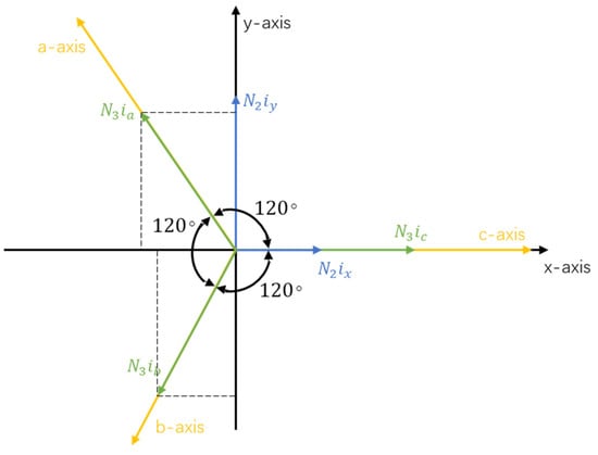 where In is the effective value of each harmonic current and θn is the initial phase of each harmonic current. Then, the correspondence between the three-phase coordinate system a-b-c and the two-phase coordinate system x-y can be established, as shown in Figure 3.