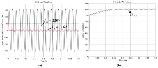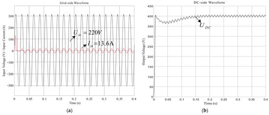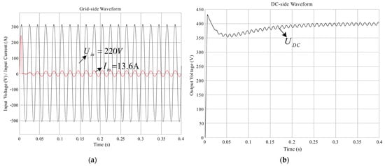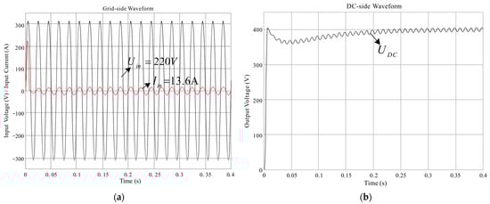During the test, due to the poor dynamic performance of the traditional PI algorithm, the DC-side voltage is likely to exceed the 500 V rated value of the electrolytic capacitor in the subsequent stage when the load changes sharply. The dynamic response test results are shown in Figure 33. When the load suddenly changes from 3 kW to 1.5 kW, the DC-side voltage changes to around 450 V; after about 0.8 s, the DC-side voltage stabilizes to 400 V. When the load suddenly changes from 1.5 kW to 3 kW, the DC-side voltage changes to about 350 V, and after about 1.2 s, the DC-side voltage stabilizes to 400 V again.