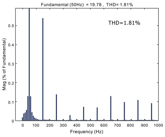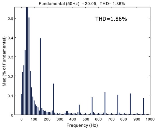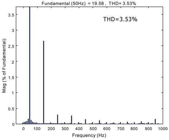 The measured steady waveforms are shown in Figure 31. The switching frequency of this design is 100 kHz, and the current control frequency is about 33 kHz. It can be seen that the current tracking voltage characteristics of the two algorithms are excellent. The THD of the traditional PI algorithm current obtained by FFT is 6.26%, and the THD of the improved predicted current algorithm current is 4.72%. During the test, the power grid is polluted by other high-power electrical equipment, and there are certain distortions and high-order harmonics. After passing through the EMI filter, part of the distortions and harmonics are attenuated. Therefore, they have little effect on the current control of the subsequent stage.