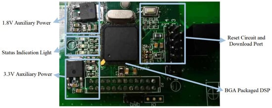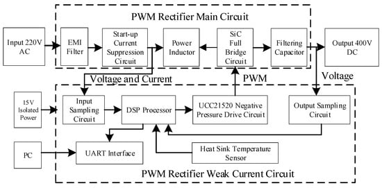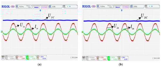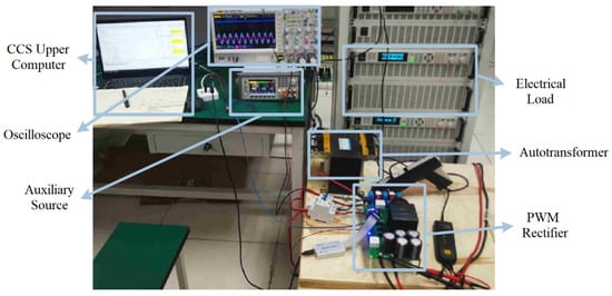 According to the hardware circuit design, the experimental platform is built, as shown in Figure 30. The measurement setup consists of a strong electricity part and a weak electricity part. For the strong electricity part, the 50 Hz alternating current of the power grid is fed into the autotransformer to realize the adjustable input voltage. The output of the autotransformer is connected to the rectifier. The load adopts an electronic load whose power can be displayed. For the weak electricity part, the system uses an auxiliary power supply. The main control microcontroller processes the collected current and voltage data and controls the PWM output. The serial port communicates with the PC to observe the state of the rectifier. The voltages and current probes of the oscilloscope are placed at the input of the rectifier to test the input current and voltage waveform.