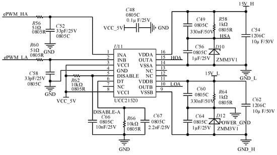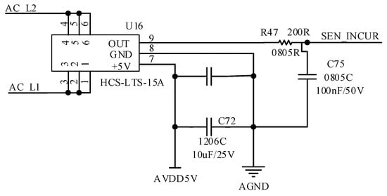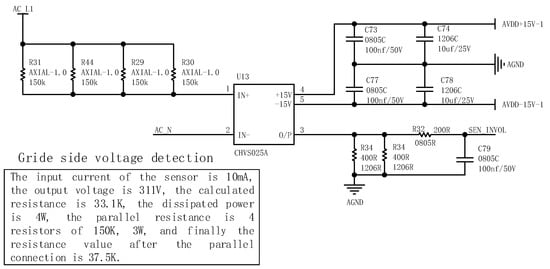 The grid-side current detection circuit is shown in Figure 26 in which the AC-side current sensor adopts HCS-LTS-15A of CoreTech Company. The sensor is on the reference voltage of the output voltage of 2.5 V. According to the current flow, the current RMS value changes 15 A, and the sensor output voltage is increased or decreased by 0.625 V on the basis of the reference voltage. It also has a current accuracy of less than 0.7% and a response time of 1 μs, which meets the needs of this design.