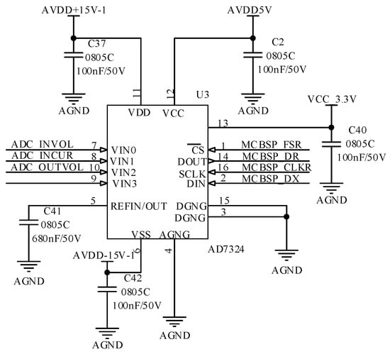 Since the input voltage range of the internal AD channel of TMS320F28335 is 0~3 V, it is impossible to directly collect the signals of ±15 V output from the voltage sensor and ±5 V from the current sensor output. Adding an external conditioning circuit will further weaken the effective number of bits of the signal. Therefore, this design selects the ADC chip AD7324 of ANALOGDEVICES company which supports positive and negative voltage acquisition and has 4 AD channels. Each channel can select the range of input voltage through software programming, and the accuracy reaches 13 bits with a sampling rate is as high as 1 MHz. The external AD sampling circuit is shown in Figure 28, where channel 1 and channel 3 are the AC-side voltage and DC-side voltage acquisition channels. Since the output of the voltage sensor is high, the external AD chip channel 1 and channel 3 are set. The input voltage range is ±15 V. Channel 2 is a current sensor, and the output voltage is only 0~5 V. Therefore, the input voltage range of channel 2 of the external AD chip is set to ±5 V to improve the sampling accuracy.