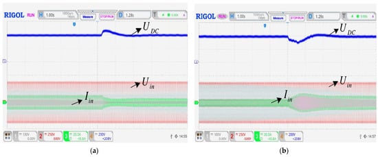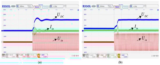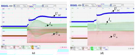 In order to prevent the PWM rectifier from generating an inrush current during startup, a thermistor with a positive temperature coefficient is added to suppress the peak current at the moment of startup. The no-load and full-load soft-start waveforms of the traditional PI algorithm and the improved predictive current control algorithm are shown in Figure 32. It can be seen that the traditional PI algorithm has obvious voltage fluctuations during the no-load soft-start. The maximum voltage is close to 500 V. With the full-load soft-start, the voltage is partially overshot, and the effect is not ideal. However, the no-load and full-load soft-start voltage waveforms of the improved predictive current control algorithm can quickly reach the expected value without serious voltage overshoot. It is overall better than the traditional PI algorithm.