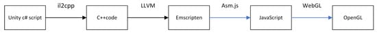 WebGL is a javascript-based graphics API. WebGL technology can help developers present 3D graphics on web pages with high efficiency. Most of the previous virtual test experiments developed by Unity3d require users to download plug-ins when the browser loads web pages, such as the flash plug-in and web player plug-in of 3d []. Using WebGL technology, users can directly run virtual test experiments by directly entering the address of relevant web pages without downloading any plug-ins []. Moreover, WebGL interacts directly with the system’s graphics card without secondary rendering through the browser, which improves its running performance []. The WebGL files required for 3D virtual simulation are generated by packaging and compiling Unity3d. Unity3d through il2cpp, emscripten, and Asm.js are three key technologies to realize WebGL. The packaging principle is shown in the following Figure 1 [,].