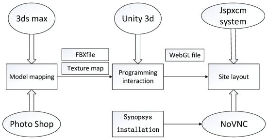 For the 3D simulation module, first, import the model made by 3ds Max and the texture map processed by PhotoShop into Unity3d []. Then, the programming and interactive development of the experimental process is carried out in Unity3d. After the interactive function is completed, package the project into a WebGL file in Unity3d and then embed the WebGL file into the front-end website []. The integrated circuit design module installs Synopsys software on the remote desktop and then arranges it to the website through noVNC [,].