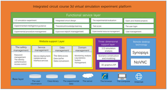 As shown in Figure 3, the platform supporting the project operation and the architecture of the project operation are divided into three layers, and each layer provides services for its upper layer until the construction of the three-dimensional virtual simulation experiment platform environment of the integrated circuit course is completed. The 3D support layer is the most important module of the platform [,,].