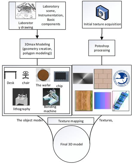 The model-making process of the experimental site, virtual equipment, and various components in the platform mainly includes real model data acquisition, modeling, scene material setting, and texture mapping. The quality of the 3D model will directly affect the rendering effect of the virtual laboratory scene. The following Figure 4 is the model-making flow chart [,].
