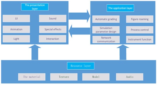 The Unity3d engine is used for 3D simulation development. The overall 3D development is divided into the presentation layer, application layer, and resource layer. The overall architecture of the 3D simulation module is shown below in Figure 8 [,]. The bottom layer is the most basic resource and presentation layer. The presentation layer provides us with visual effects, auditory effects, and human–computer interaction. The application layer is a logic control module which generates corresponding feedback to the interaction, controls the resource allocation of the whole three-dimensional virtual simulation experiment, and records the experimental steps through network communication. The presentation layer provides corresponding resources and effects for the application layer, and the application layer will control the presentation effect of the presentation layer.