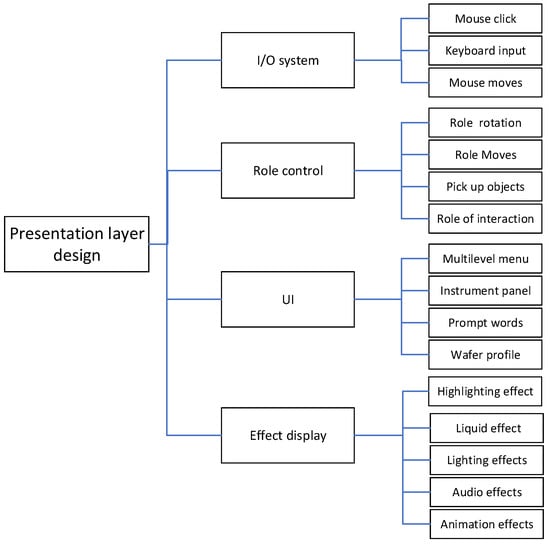 The interaction layer greatly affects the immersion of the experiment, which will greatly affect students’ learning efficiency and passion []. In order to improve the interactivity, the system uses the first person plug-in first-person exploration kit (fpek) in the interaction design module. Fpek is the first-person functional plug-in of 3D, which has strong interactivity and expansibility, which is very conducive to expansion and development. Fpek has complete functions and the strong expansibility of the UI system, which can completely save and read the game. On the basis of fpek, the platform further develops and expands the original UI and related interactive settings of fpek, including a multi-level menu system, role controller (can walk, run, jump, squat), etc. In addition to fpek, the platform also develops an object highlighting function, instrument panel, task box, prompt text, current step prompt, light effect, liquid effect, and other display effects []. The overall functional structure of interaction design is in Figure 9.
