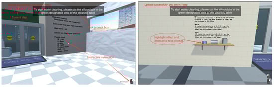In chip manufacturing, CVD equipment is taken as an example to illustrate the equipment operation steps. First, click the switch through the center point and the left mouse button to start the CVD device and operate according to the contents of the prompt column above. Then, click the push boat button to exit the quartz boat, pick up the silicon wafer box, and put it on the quartz boat. Next, click the yellow button to open the equipment menu, select the materials required for the PECVD process, remaining time, target temperature, and other indicators, and click the boat entry button to wait for the verification of the experimental results. If the experimental data is inputted incorrectly, the experiment will be carried out again []. Figure 11 shows some basic operations of the CVD experiment.