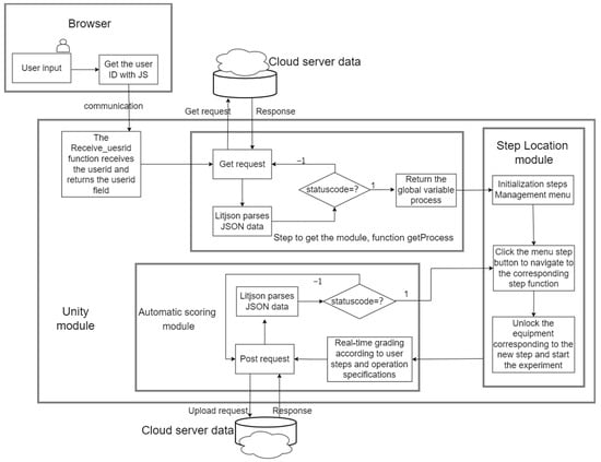 The platform is presented in the form of web pages and can be accessed and used through the Internet. There is no need to consider the burden of equipment, laboratory capacity, student site management, and other issues in the real experiment. It is convenient for carrying out large-scale class experiments and open to society. The platform can support all current mainstream browsers, and the website of the experimental teaching management platform can be accessed through the browser. Students can carry out interactive and autonomous learning on the platform, including downloading materials, watching videos, interactive discussion, completing virtual experiments, etc. The instructor of the experimental course can guide, score, and manage tasks on the platform []. The platform integrates remote desktop technology, 3D graphics development technology, human–computer interaction technology, and website construction technology in four modules: integrated circuit design and manufacturing, packaging, and testing []. The complete experiment includes 26 large steps and 166 small steps.