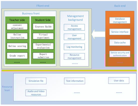 The function layer is the final presentation, and use of the developed platform functions and services and generally includes the experimental function, experimental teaching management, theoretical knowledge learning, experimental resource management, experimental report management, teaching effect evaluation, project opening and sharing, etc. [,,].