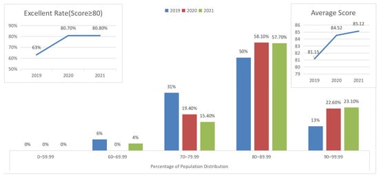 In order to verify the teaching effect after using the integrated circuit virtual experiment platform, we make a statistical analysis of the final exam grades of the classes that have set up the integrated circuit courses in Beijing University of Posts and Telecommunications in the last three years. There are 40 students in the class offering the course, which are junior college students. The score statistics of students are shown in Figure 23 below. The integrated circuit virtual experiment platform has been used since 2020, and the integrated circuit virtual experiment platform was not used in 2019. By observing the figure, it can be found that after using the integrated circuit virtual experiment platform, the average score and excellent rate of students (score ≥ 80 is excellent) has been greatly improved. Compared with 2019, the average score in 2020 increased by 3.37 points and the excellence rate increased by 17.7%. In 2021, the average score increased by 3.97 points and the excellence rate increased by 17.2%. The significant improvement of students’ scores in the integrated circuit course shows that the integrated circuit virtual experiment platform is of great help in improving students’ mastery and understanding of integrated circuit course knowledge.