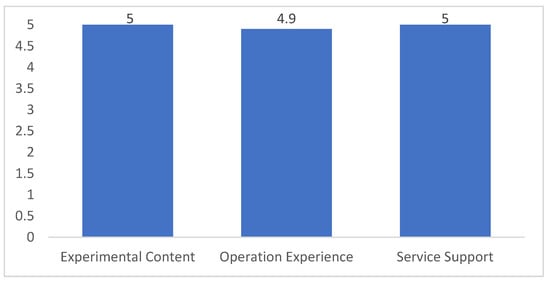After the students finish the experiment, they can grade the experiment and leave a message. At present, our online user evaluation system has received effective evaluations from 89 students, mainly junior college students in electronic information, who account for 70% of the responses. The evaluation is conducted from three perspectives: experimental content, operation experience, and support service. The full score of the evaluation is 5 points. The higher the score, the higher the students’ satisfaction with the evaluation. The above figure is the average score of the final statistical student evaluation. As shown in Figure 24, the evaluation items of the experimental content include the rationality of steps, logical correctness, and the adequacy of prompt information. The evaluation items of operation experience include experimental loading time, visual effects, auditory effects, operation fluency, and network stability. The evaluation items of service support include online guidance service and teaching materials. From the students’ scores, the experimental content and service content satisfaction are full marks, which shows that the platform performs very well in the overall content logic and supporting services. However, there is still room for improvement in the operation experience. From the students’ reflection, the visual and auditory effects are good, but the first loading time of the experiment is still long, and there is still room for improvement in operation fluency and network stability.