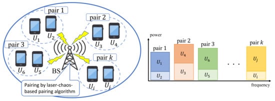 In NOMA, the basic idea is to serve multiple users or devices in the same resource block. Since the signals of multiple users are superimposed in the power domain, the receivers conduct multiuser-detection (MUD) algorithms, such as successive interference cancellation (SIC), to identify individual signals [,,]. In NOMA systems, user pairing and resource allocation are important to achieve its potential communication performances [,]. In the present study, we focus on user pairing and assume that the number of multiple users in the same resource block simultaneously is two. Hence, precisely, user pairing herein means combining two users to share the same resource block. In NOMA systems, the performance varies depending on user pairings; for instance, signal-to-interference-plus-noise ratio (SINR), throughput, and so on [,]. Thus, the pairing scheme is important and attracts increased attention.