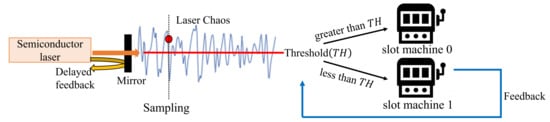 When a portion of the output light from a laser is fed back to the laser cavity after a certain delay via an externally arranged mirror, instability of the laser is induced, leading to chaotic oscillatory behavior []. Figure 2 shows the decision making based on laser chaos time-series produced by a semiconductor laser []. The principle of decision-making based on laser chaos is summarized as follows. By comparing the sampled amplitude of the laser chaos time-series with the threshold value, a decision on the slot machine selection is made. Here we consider a two-armed bandit problem where the issue is to promptly and accurately find the higher reward probability slot machines. The two slot machines are called machine 0 and machine 1. If the sampled amplitude of the laser chaos time series is greater than or equal to the threshold value, slot machine 0 is selected. Otherwise, the decision is to choose slot machine 1. The threshold is adjusted according to the reward from the selected slot machine (in other words, win or lose) so that the slot machine with the higher reward probability will be selected in the subsequent trials.