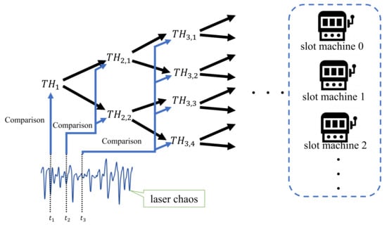 By cascading the above-described algorithm, the scalability of the laser chaos decision-maker is realized []. By arranging pipelined thresholds, we can choose one among multiple slot machines. Figure 3 illustrates the scalable decision-making utilizing laser chaos time-series. More concretely, scalable decision-making follows the rule below. At step , the level of chaotic output is compared to the threshold . At step , the level of chaotic output is compared to the threshold , if is greater than or equal to . Otherwise, is compared to the threshold . Similarly, at step , is compared with either . In this manner, comparisons with the chaotic signals and multiple threshold continue until a slot machine is selected. Thus, comparisons with the chaotic signals and multiple thresholds allow scalable decision making.