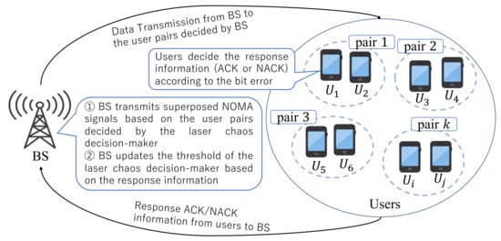 Here, we explain the system behavior with the laser chaos decision-maker in detail and the definition of the concepts, e.g., reward, used to operate the laser chaos decision-maker. In this study, user pairing is decided by the BS using a laser chaos decision-maker aiming to accomplish the optimal communication performance, i.e., minimizing BER. The outline of the proposed scheme is shown in Figure 4, and is described as follows.