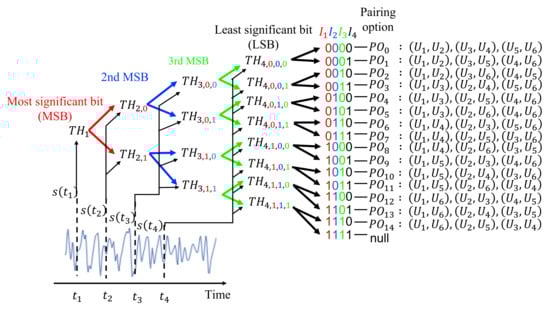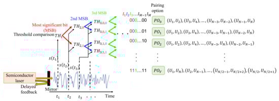 For intuitive understanding, Figure 6 illustrates an example when the number of users is six in a NOMA system. In this case, the number of pairing options is 15. Hence, with can accommodate 15 pairing options. , , and , respectively indicates the MSB, the second MSB, the third MSB and the least significant bit. The pairing option is associated with 0000, is associated with 0001 and other pairing options are associated as well. By adjusting the threshold , the “null” option, corresponding to the index 1111 in Figure 6 is never selected; hence, the laser chaos decision-maker selects the pairing option among to . The index of the pairing option to be selected is decided bit by bit from MSB to the least significant bit in the pipeline rule.