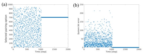 First, we visualize the behavior of the laser chaos decision-maker. Figure 7a shows an evolution of the actually selected pairing option index as a function of time, where the pairing is not settled initially but stabilized after approximately 1000 steps. More precisely, the proposed method converges to select the pairing option. Similarly, Figure 7b demonstrates the time evolution of the sum of the number of bit errors for all users, which is denoted by . We observed that converges to a small value, which is actually zero, after approximately the time step of 1000. That is, the laser chaos decision-maker achieves the optimal pairing, achieving zero .