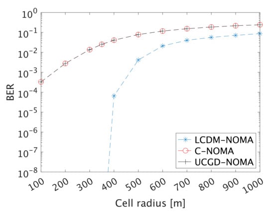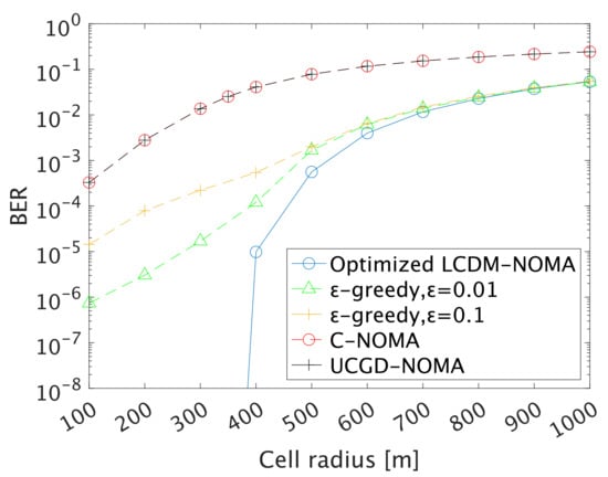 Figure 8 examines performance comparison among C-NOMA, UGCD-NOMA and the proposed method (LCDM-NOMA) with respect to the BER after 2000 steps while modifying the cell size under study. The cell radius is configured from 100 m to 1000 m with a 100 m interval. The number of the threshold level in LCDM-NOMA was specified by . Figure 8 demonstrates that the proposed LCDM-NOMA achieves a smaller BER than the C-NOMA and UCGD-NOMA. Specifically, the LCDM-NOMA can get 99.79% improvement compared to C-NOMA and UCGD-NOMA when the cell radius is 400 m. Therefore, we conclude LCDM-NOMA is better than C-NOMA and UCGD-NOMA concerning BER.