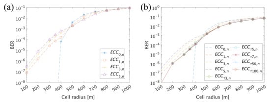 Next, we evaluate the BER with adaptive , where is set as an adaptive value. The value of is defined as the average bit errors of the last times for user n. Adaptive at step t can be expressed as: . We denote as the adaptive with , meaning that the ECC is the average bit errors of the last five transmission times for user n. In this simulation, the parameter Z for the laser chaos decision-maker is set to one. Figure 9b summarizes the simulation results while changing the cell radius from 100 m to 1000 m. From Figure 9b, with a larger cell radius, we can see that the adaptive ECC method with accomplishes smaller BER in the NOMA system while can get smaller BER than other settings. With a smaller cell radius, on the other hand, the setting of accomplishes the smallest BER.