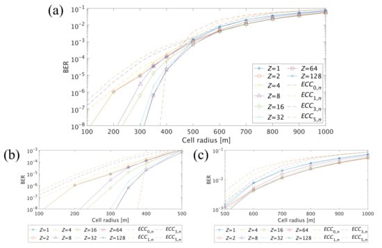 (a) BER comparison with the different number of thresholds related to the laser chaos decision-maker. (ECC is set to for . Z is set to 1 for , , , ). (b) Magnified view of (a) with respect to smaller cell radii; (c) magnified view of (a) with respect to smaller cell radii.