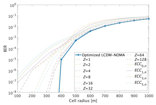 We evaluate the performance in terms of BER of the proposed LCDM-NOMA considering parameter optimization via , and compare it with the case without considering parameter optimization. The solid line in Figure 11 demonstrates the BER when the parameter optimization is employed in LCDM-NOMA, whereas other lines represent the cases without parameter optimization. In the optimization, ECC is also dynamically reconfigured. ECC is given by for all users; namely, ECC is adaptively configured with . Meanwhile, Z is set, as the best Z corresponds to the setting of the cell radius before is satisfied. Once is achieved, the ECC is set as while Z is set as 1. This setting means that ECC is adaptively reconfigured when bit errors are present, whereas once the error-free situation is accomplished, ECC does not look back at past information. From Figure 11, the optimized LCDM-NOMA exhibits lower BER than other cases thanks to the three-valued and dynamic ECC setting reconfiguration.