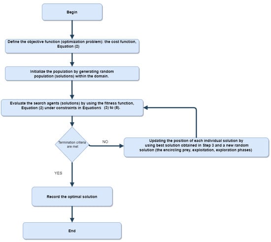 A fitness function (optimization problem) is used to evaluate the solutions and then move towards the optimal solution, based on the inspiration of whale behaviors [8]. The main steps for solving the HAPF optimization problem, Equation (2), by using the WOA algorithm, are summarized in Figure 3. The objective function (optimization problem), the cost function, Equation (2), is selected as the problem we aim to solve and the fitness function in WOA. Then, the WOA starts with generating a random population (exploration phase) within the domain by using the following equations