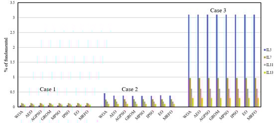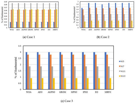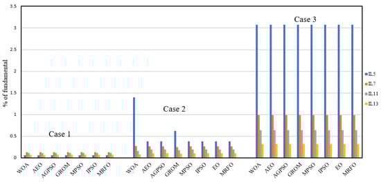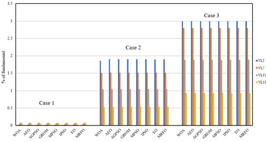 The individual voltage and current harmonics, () and (), for configuration 2 of HAPF are shown in Figure 6 and Figure 7, respectively. The results show that all optimization algorithms satisfied the limitation of harmonics. In addition, the results in this section showed that the increasing trend of voltage from cases 1 to 3 led to an increase in the harmonic level. In Figure 6 and Figure 7, the WOA outperformed the other proposed optimization algorithms by reducing the current harmonics (). For example, the WOA in Figure 6 reduced the current harmonics () at cases 1 and 2 by 75%, and 5% compared to other algorithms. Similar to configuration 1, the voltage and current harmonics () and () increased over the three cases with increasing voltage source harmonics. The WOA outperformed all algorithms and slightly improved performance, except for the in case 2, where the WOA recorded the highest value with 0.45%. However, the WOA for the in case 2 satisfied the limitation ( . The results of all algorithms at configuration 2 showed better results compared to configuration 1.
