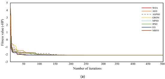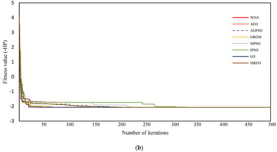 To evaluate the convergence for the proposed optimization algorithms, convergence curves for all cases were generated over 500 iterations. The convergence curves show the relationship between the number of iterations and the HP value. The convergence curves introduce the speed of the optimization algorithm in achieving the final (optimal) solution. For example, Figure 8 shows the convergence results for all optimization algorithms for configurations 1 and 2 of the HAPF system within case 3 parameters. The results presented smooth convergence curves for all optimization algorithms. However, the WOA algorithm achieved the optimal solution with a smaller number of iterations compared to other algorithms. In addition, the GROM, AEO and EO algorithms showed similar convergence behavior to WOA. All algorithms achieved the optimal solution with less than 300 iterations for all cases, compared to the L-SHADE algorithm [8], which required more than 1500 iterations to achieve the optimal solution. The results in Figure 7 show that the proposed optimization algorithms in this paper are more efficient and powerful compared to L-SHADE [8], in terms of computational cost and higher efficiency in CPU utilization. In addition, the results of all algorithms at configuration 2 showed better results, in terms of the fitness value, by 10%, and in computational cost by 32%, compared to configuration 1. This is mainly due to the convergence curve of the WOA leaning towards being accelerated as iteration increases. The WOA convergence curve has been accelerated regarding the WOA searching for promising regions in the initial steps and can derive an adaptive strategy and update information to help to avoid an extra number of iterations.