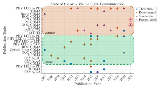 All these studies are illustrated in Figure 1. It can be seen that there has been no real trend or evolution in MAC solutions over the past decade. Most of them are based on simulations; five are based on the IEEE 802.15.7 standard with modifications and six (excluding our study) on CDMA.