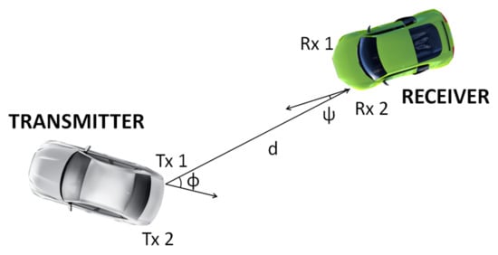Relative positioning of a transmitter (left vehicle) and a receiver (right vehicle).