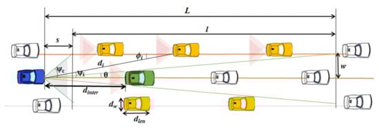 Here, is the bumper to bumper distance between the green and blue vehicles, is the vehicle width, is the shadowing angle formed between the receiver PD and the intended transmitters vehicle body, and w is the lateral distance between the receiver and transmitters on the adjacent lane (see Figure 3). Due to FOV condition, the longitudial distance s, starting from which, the LOS path gets in the FOV receiver, is found as follows: